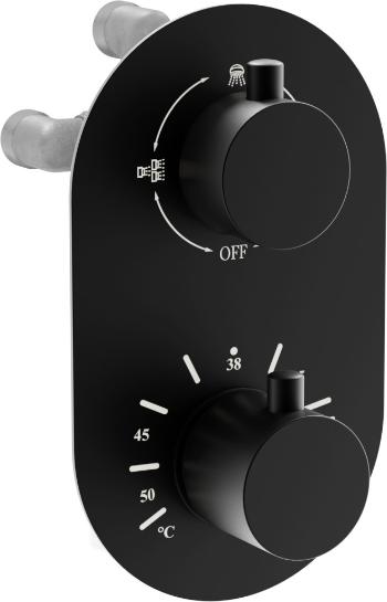 Technická data: Materiál: Tělo z mosazi Hlava: termostatická Připojení: 2x G 1/2 "vstup a 2x G 1/2" výstup Blokování horké vody při 38 ° C Sada: zapuštěná a přisazená část Černá barva EAN: 5907709110885